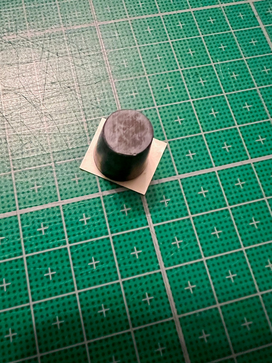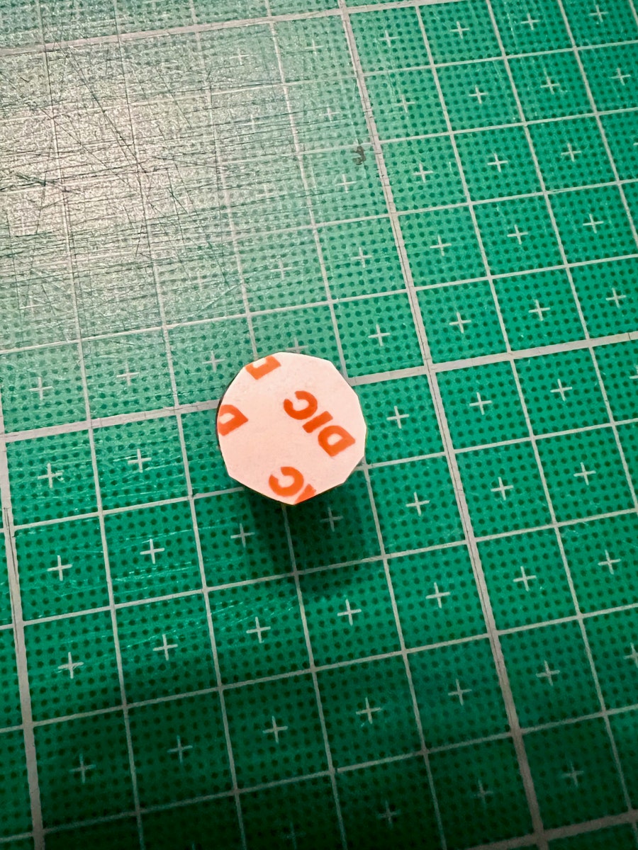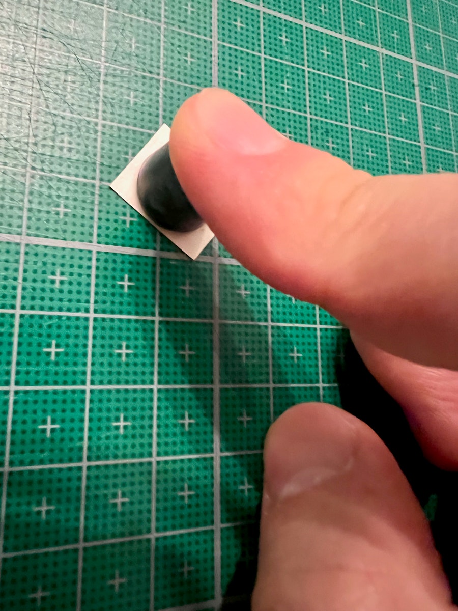 ゴム足用両方テープの上に黒いゴム足(大)の面積の広い方をおいて、ハサミでカットするあたりを付けます。