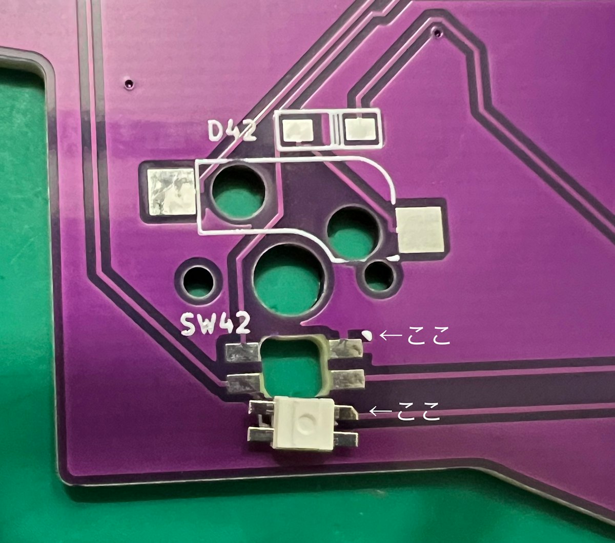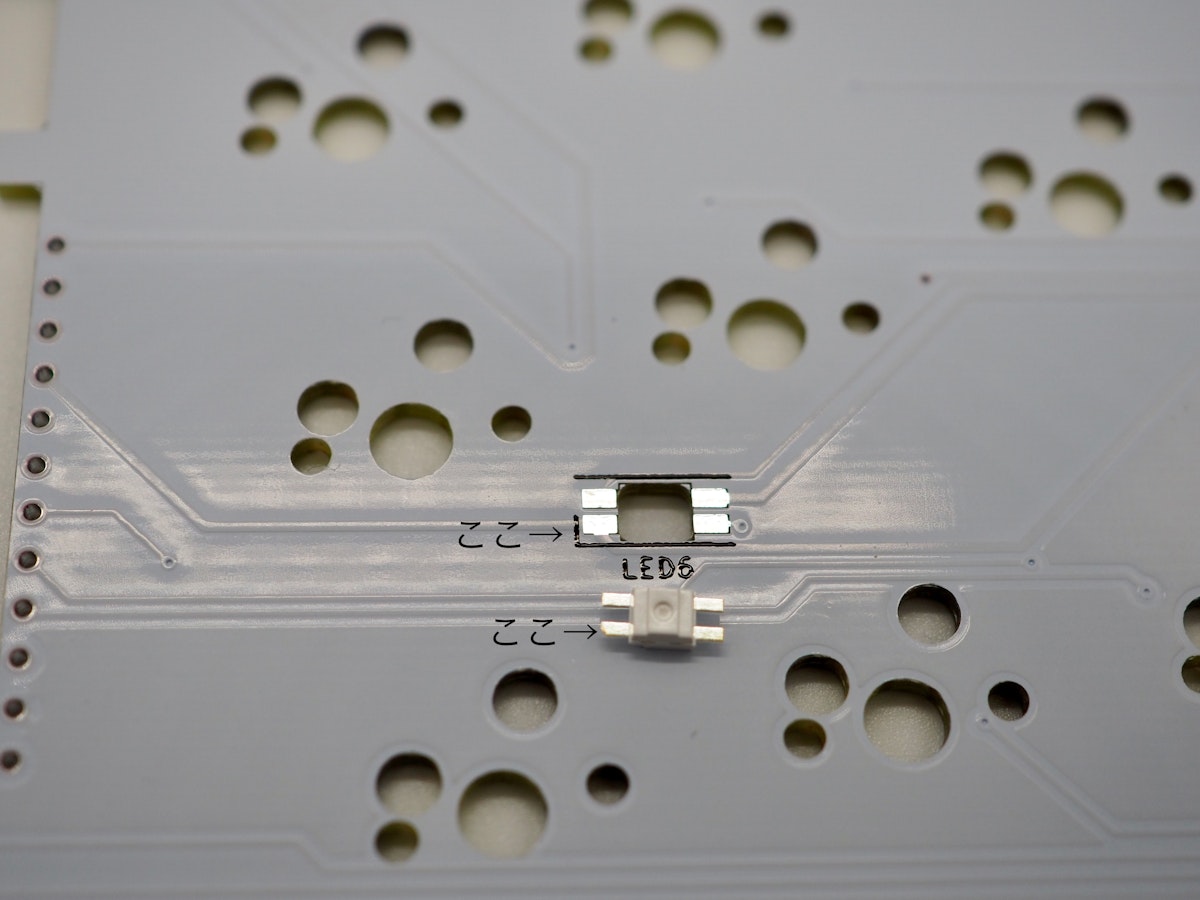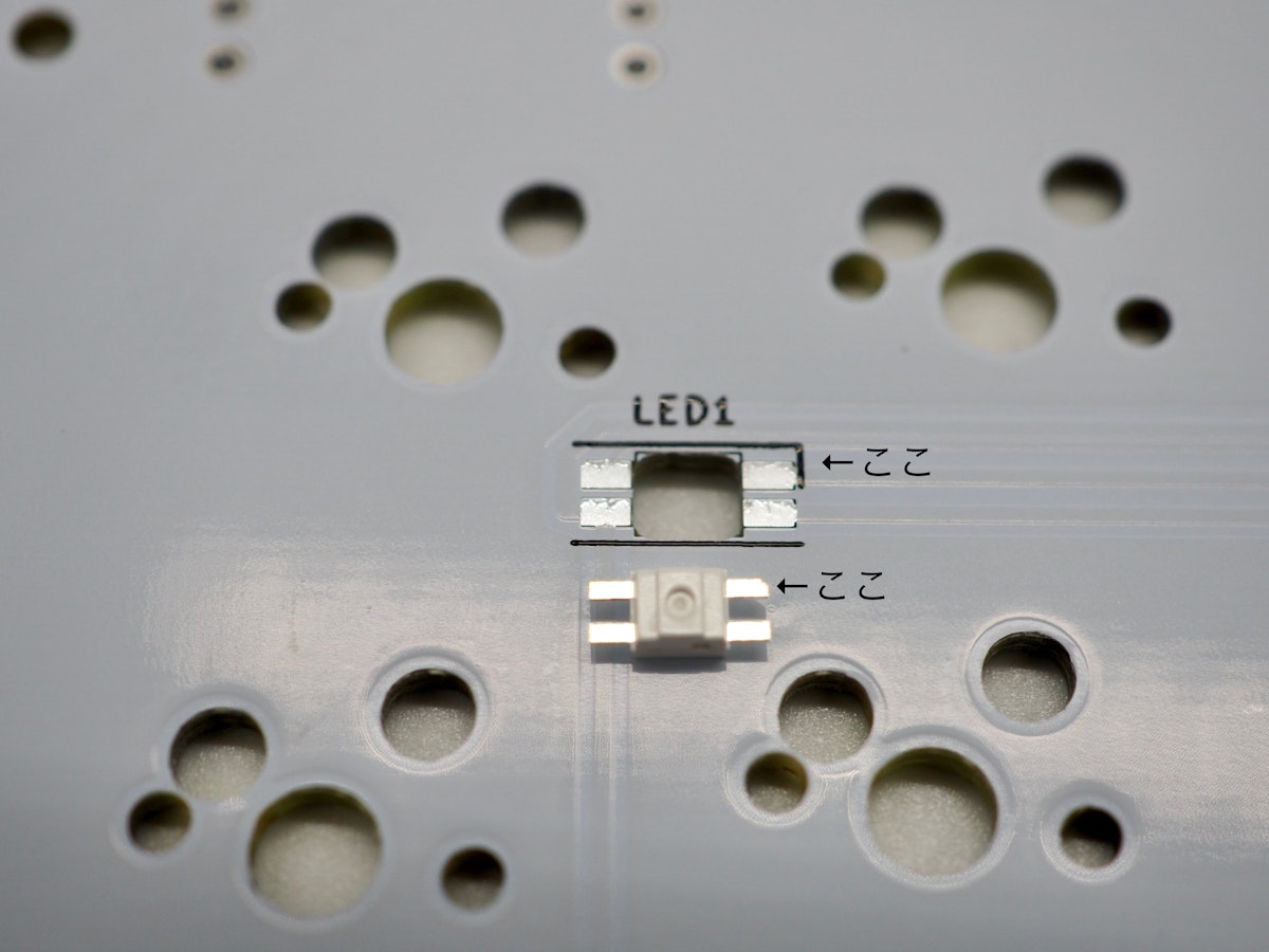 写真の通り、シルクの指定場所とLEDの足が欠けた部分を合わせて半田を行ってください。