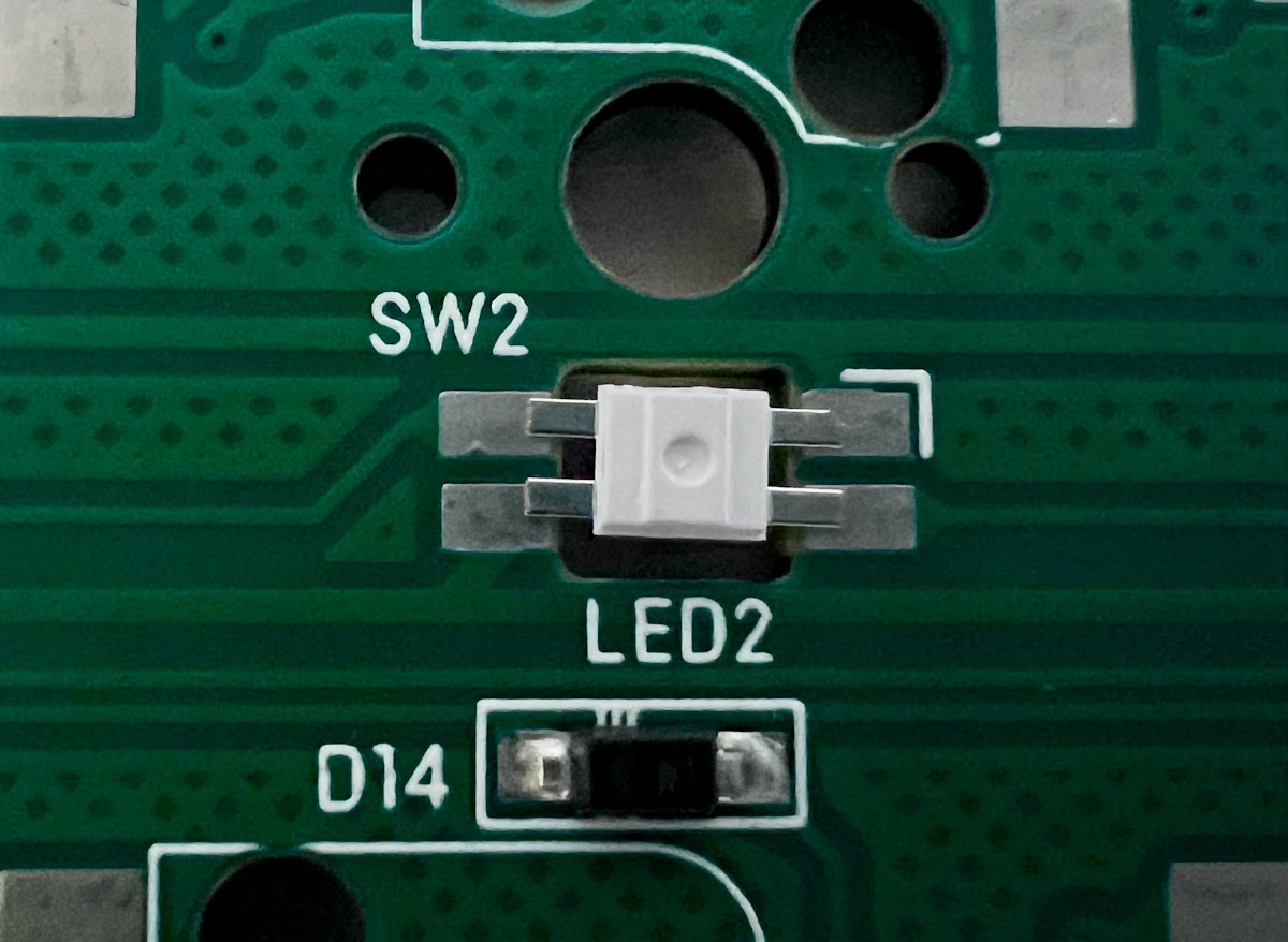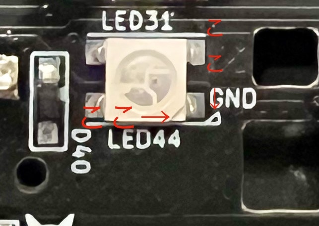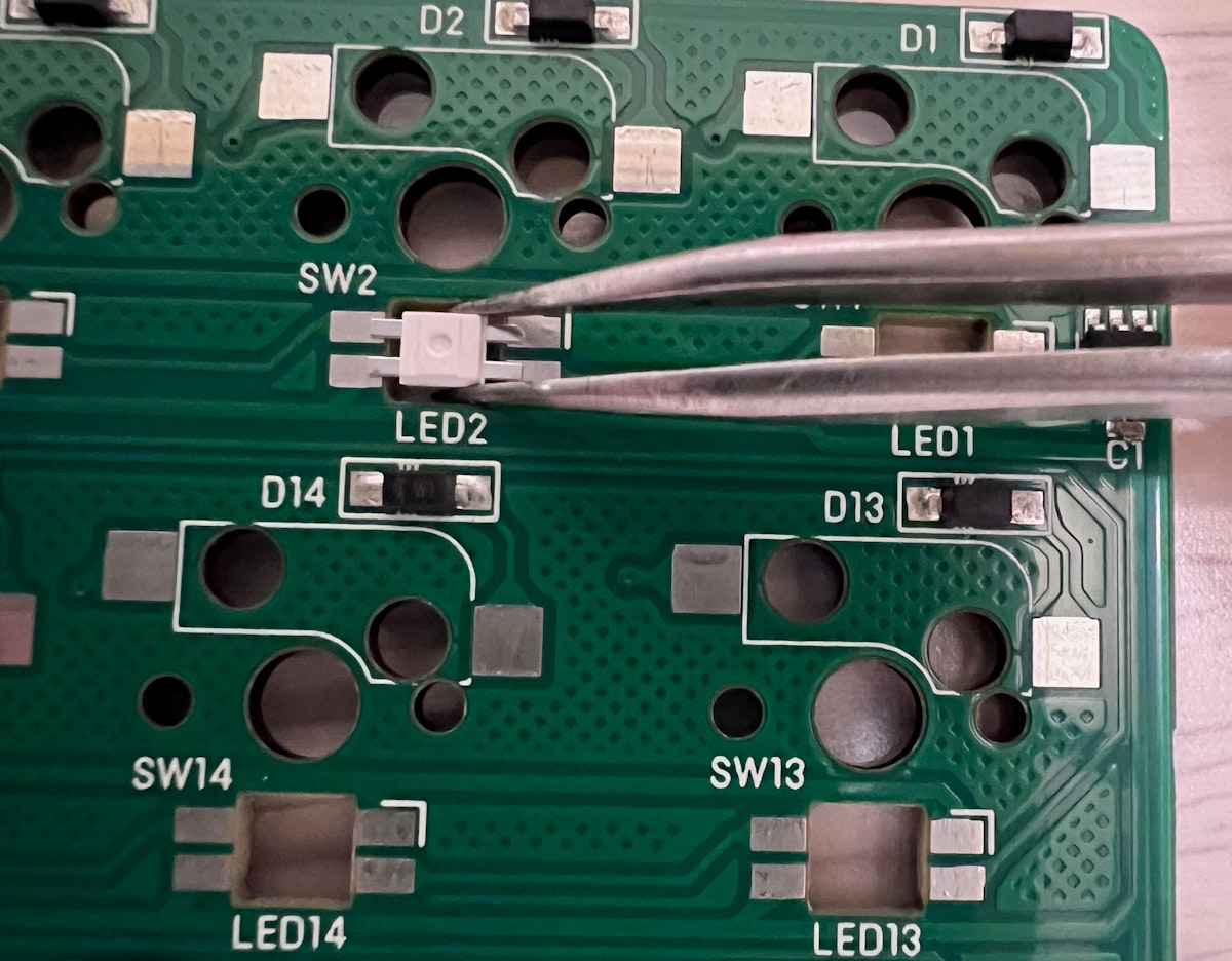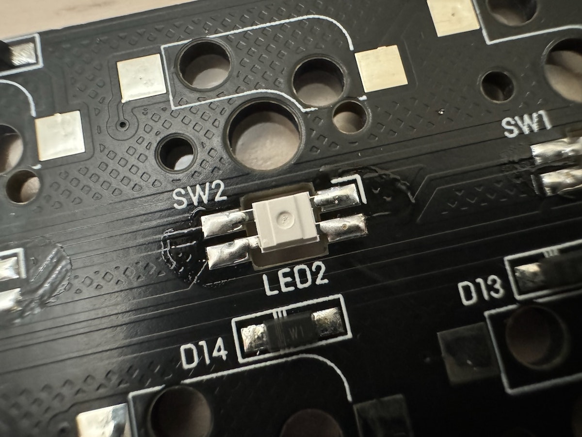 写真の通り、シルクの指定場所とLEDの足が欠けた部分を合わせて半田を行ってください。