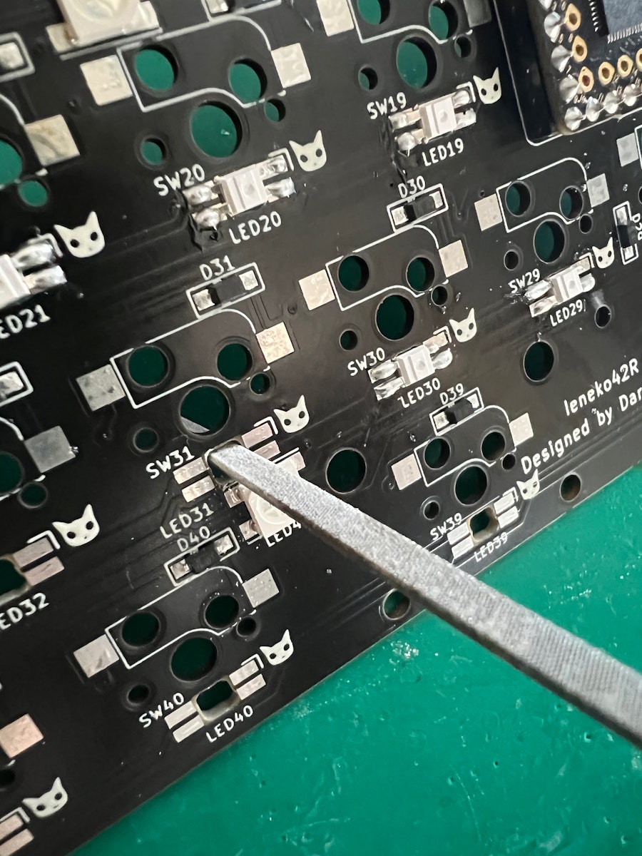 穴に入れにくくLEDの爪ととパッドの間が浮いていても半田で繋がっていればいいので、多めに半田を付けて繋げても問題ありません。