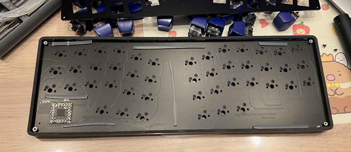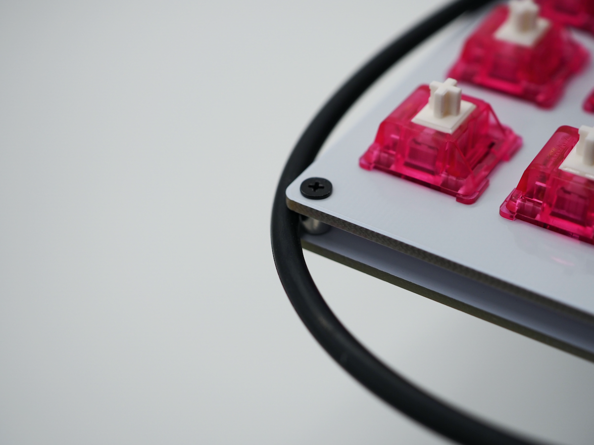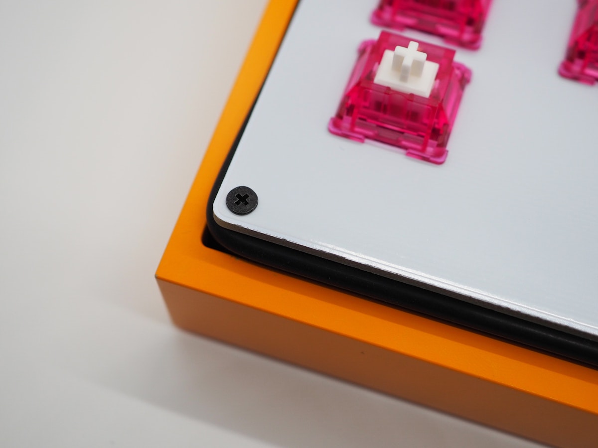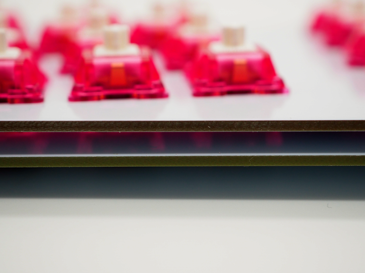 トッププレートがアクリルの場合はメインプレートの上に3mmのシリコン紐を入れるのがおすすめですが、高さ3mmで固定できるものであればなんでもいいです。