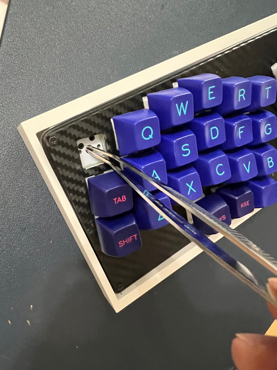 ピンセットが付属している場合はピンセットを一番大きいキースイッチ穴入れて、梃子の原理で持ち上げてください。