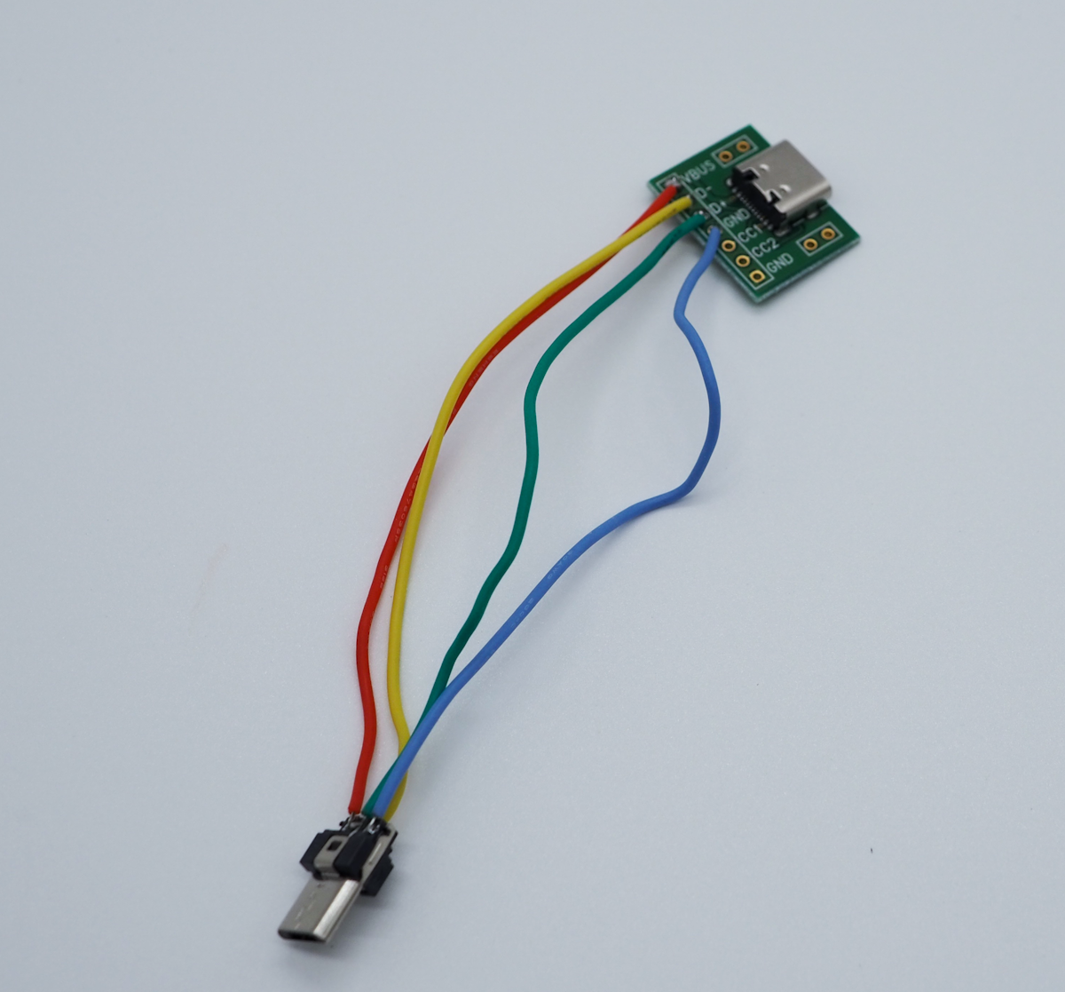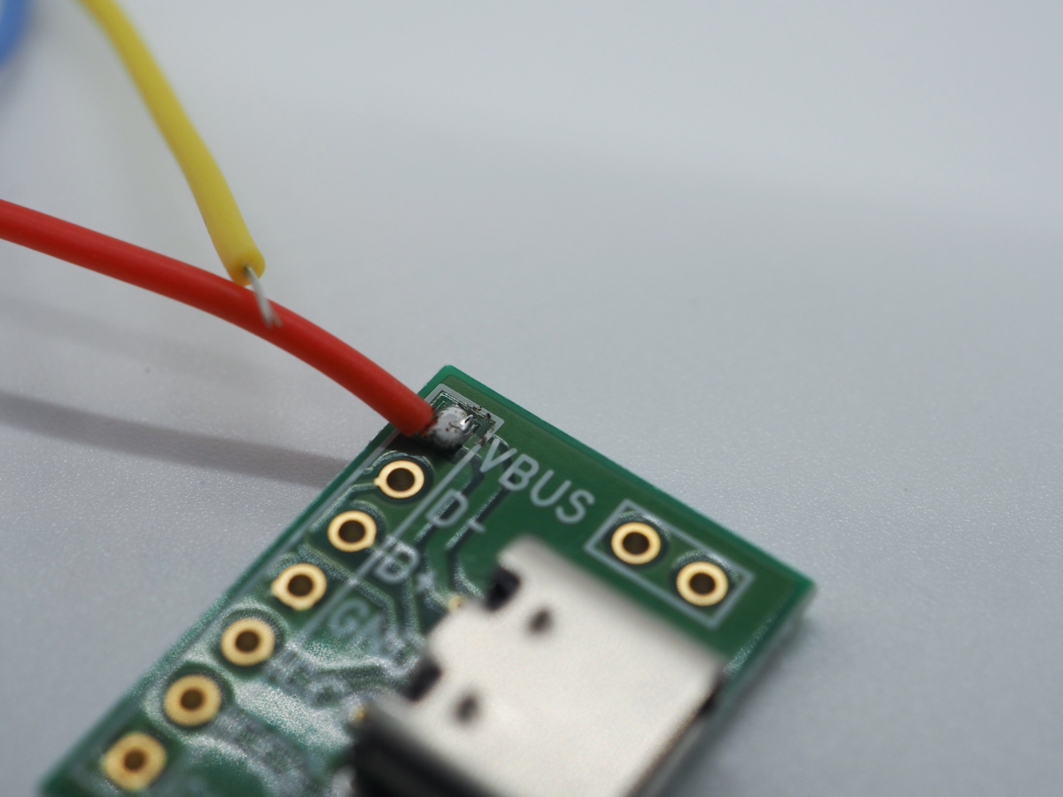 写真の通りにmicroUSBコネクタ----Type-Cコネクタにシリコンワイヤーをハンダで取り付けてください。