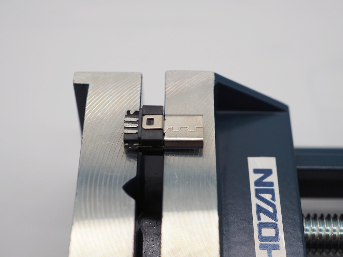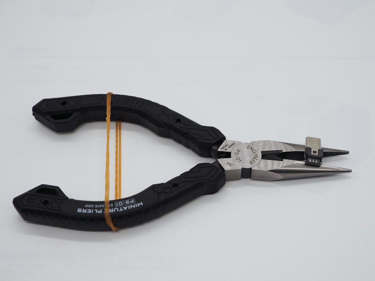 microUSBコネクタは万力がない場合はラジオペンチの持ち手の膨らみ辺りに輪ゴムをくくり付けると固定できます。(古の技ですね)