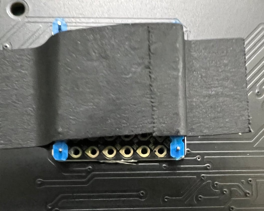ピンの向きはどちら側でもいいですので、細ピンヘッダをピンの数合わせてプラ部分をニッパーでカットし、細ピンヘッダをセットしたらマスキングテープなどで固定します。