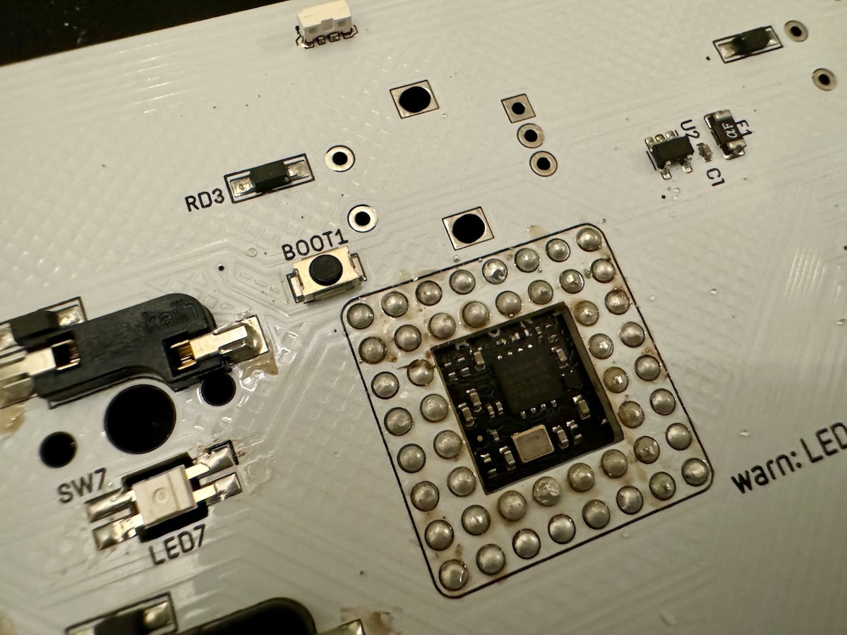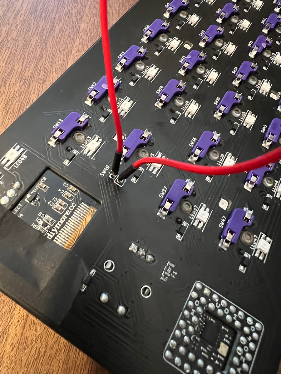 出てこない、またはマスストレージモードにしたい場合、PCとキーボードがつながっている時は一旦ケーブルを外し、SW*やBOOTなどと書いてあるボタン押しながら、または2pinの所に精密ピンセット又はジャンパーワイヤー(テストワイヤー)を使って写真のようにショートさせた状態で、PCと繋ぐとマスストレージモードになり、RPI-RP2と書かれた外部ディスクが現れます。