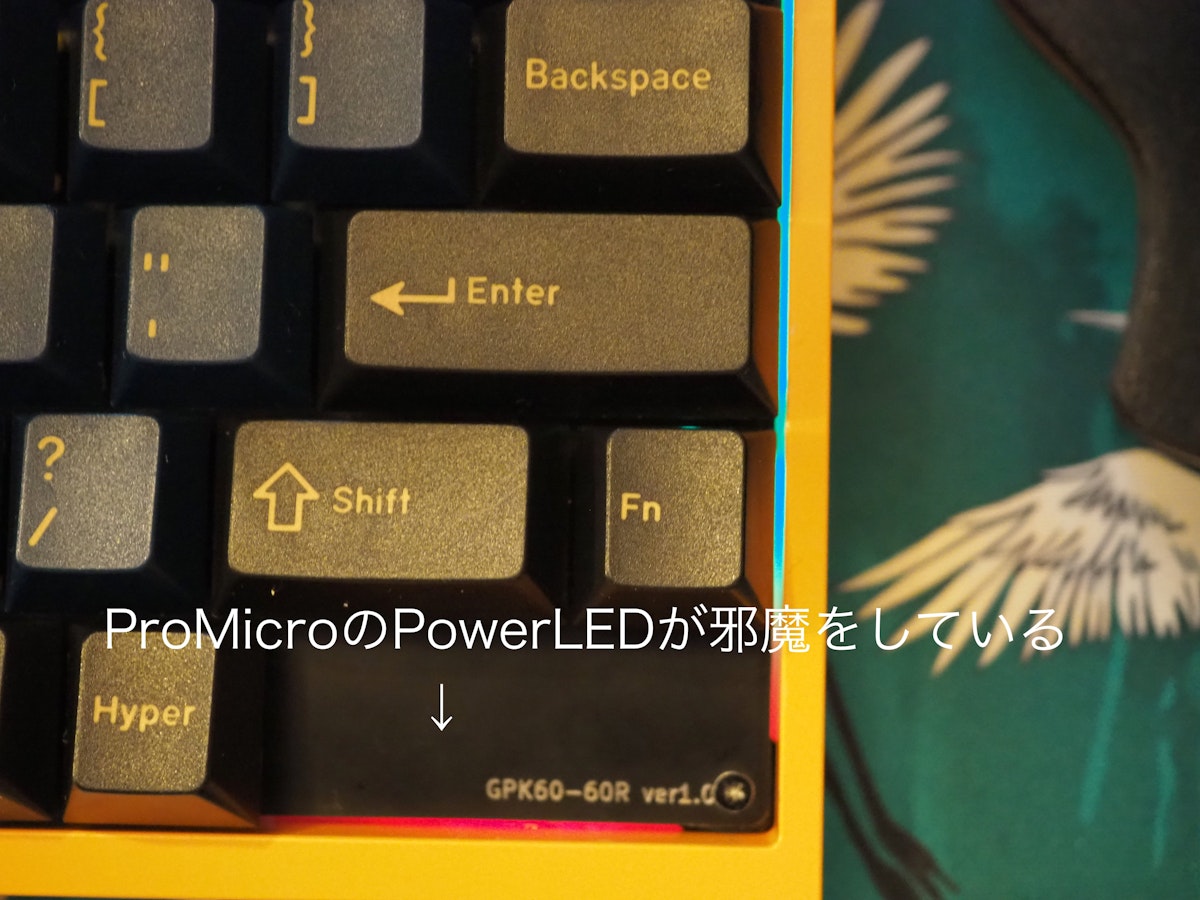GPK60シリーズやNum-Num StrawberryはメインプレートにProMicroを埋め込むので、PowerLEDがUnderglowのLEDを邪魔してしまうことがあります。