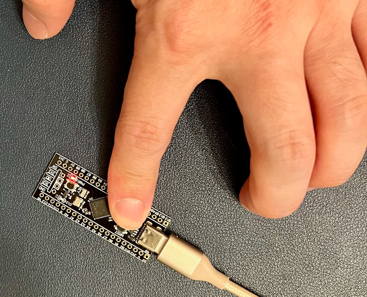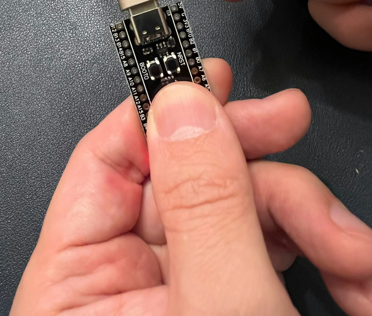 もし、DFUモードに入らない場合は、マイコンのチップを指で温めてBOOT0ボタンを押し、そのままNRSTボタンを押します。