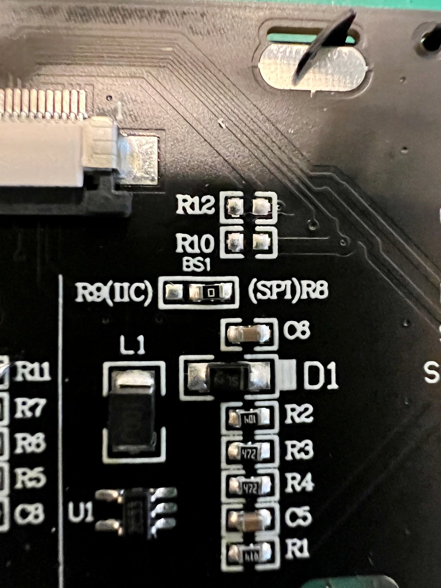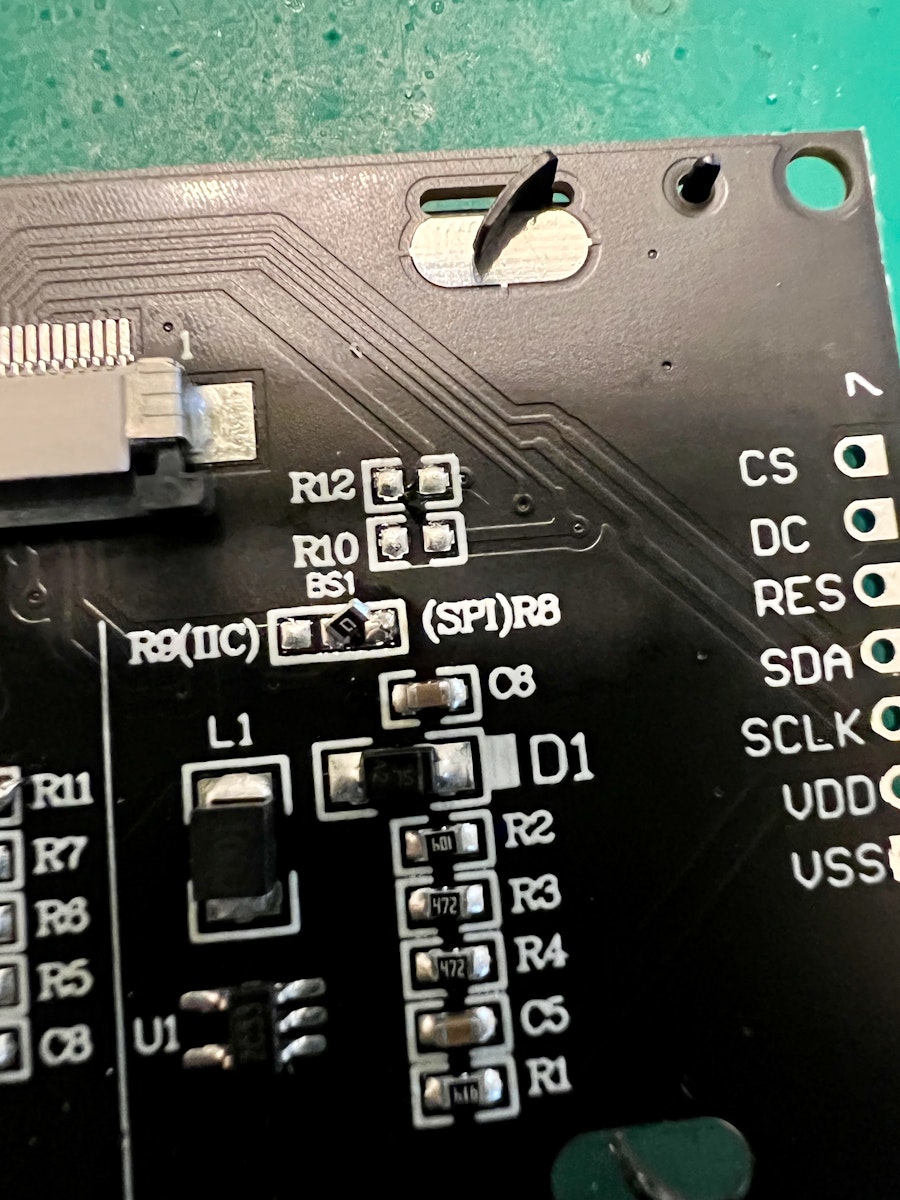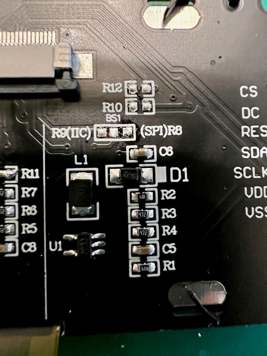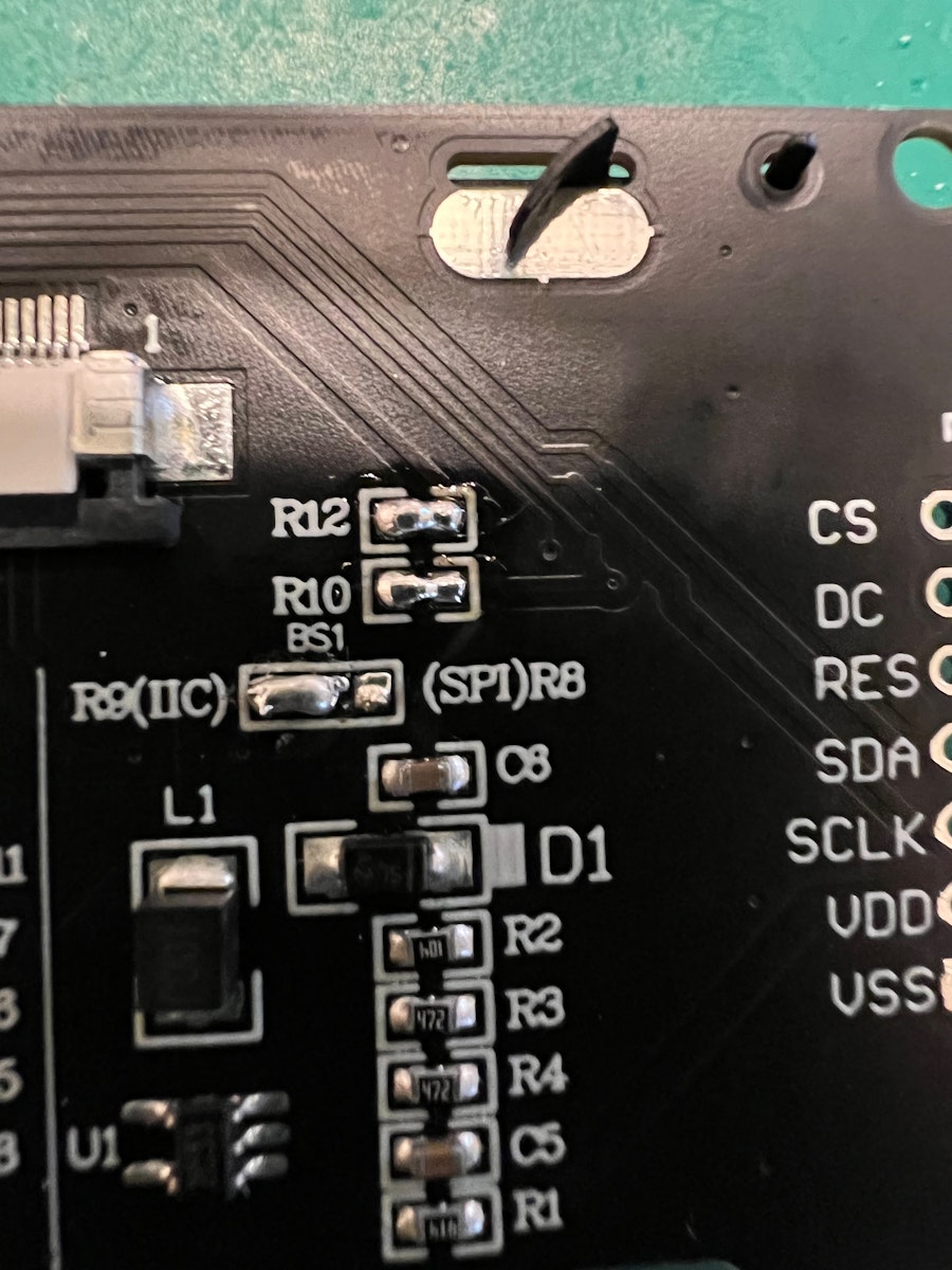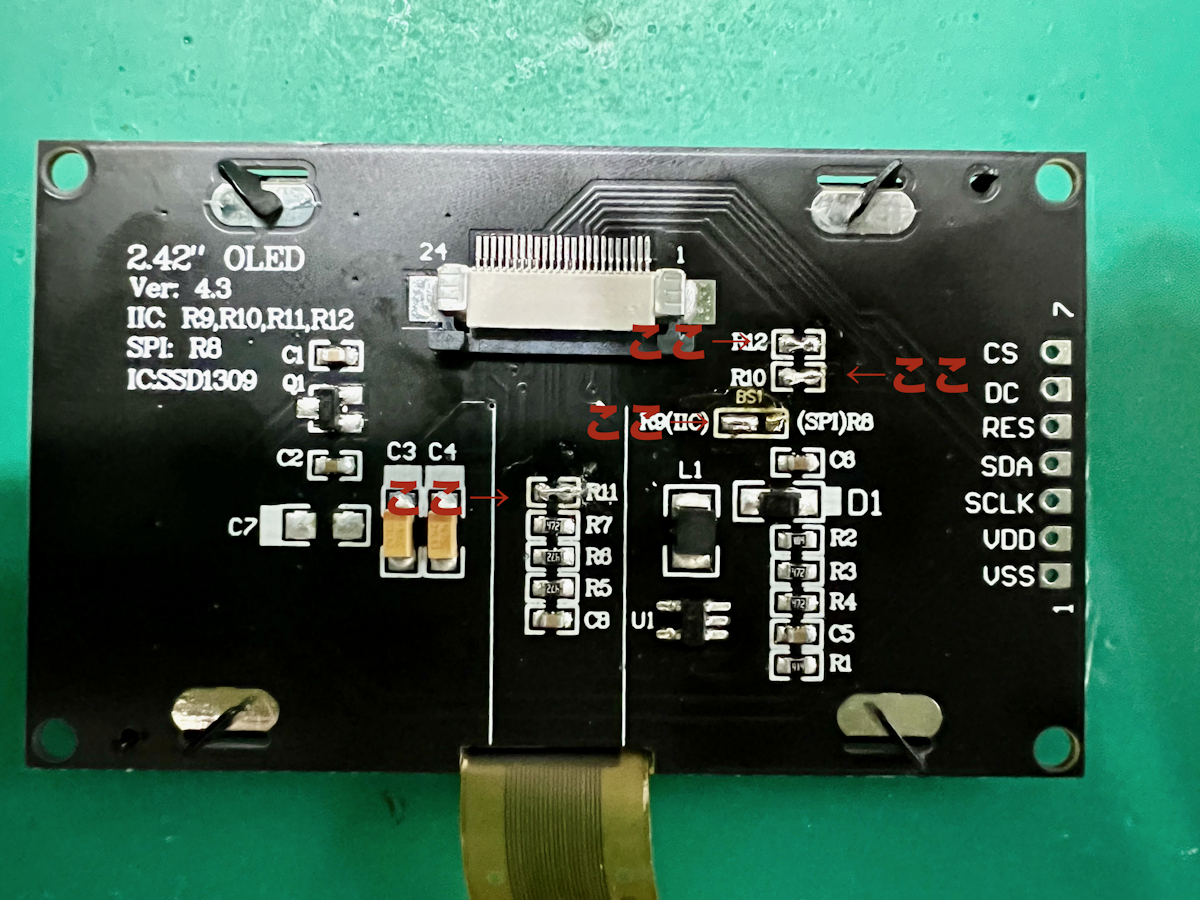 OLEDがデフォルトではSPIモードになっているので、I2Cモードに切り替えるために半田をする必要があります。