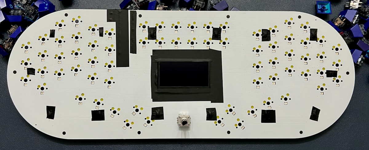 写真の例では何もしないとLED、ProMicro、リセット穴が見えますが、黒マスキングテープを貼ることによって隠蔽されています。