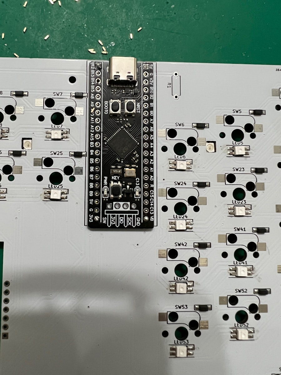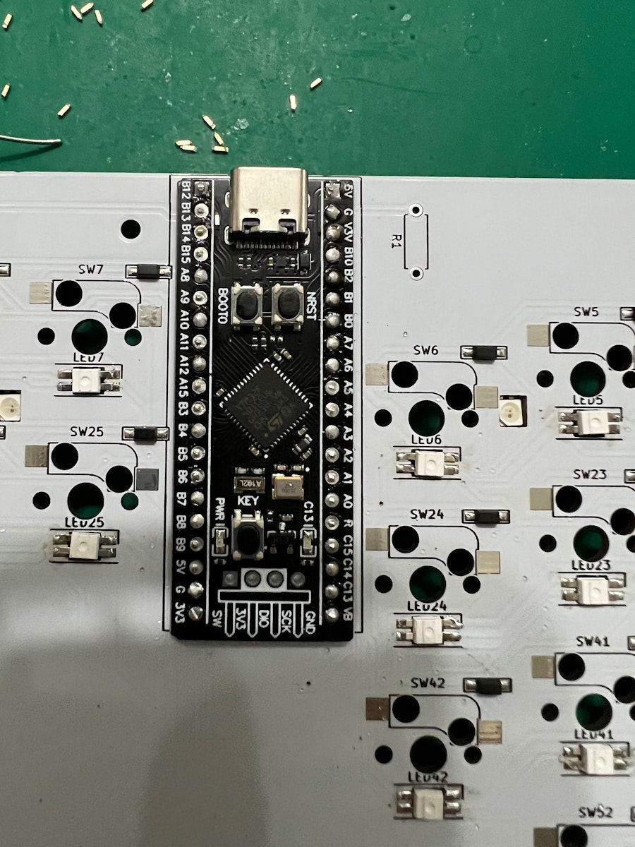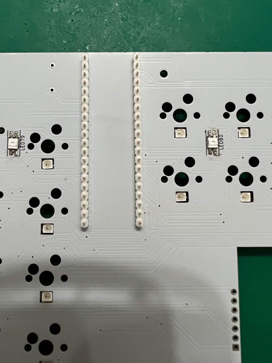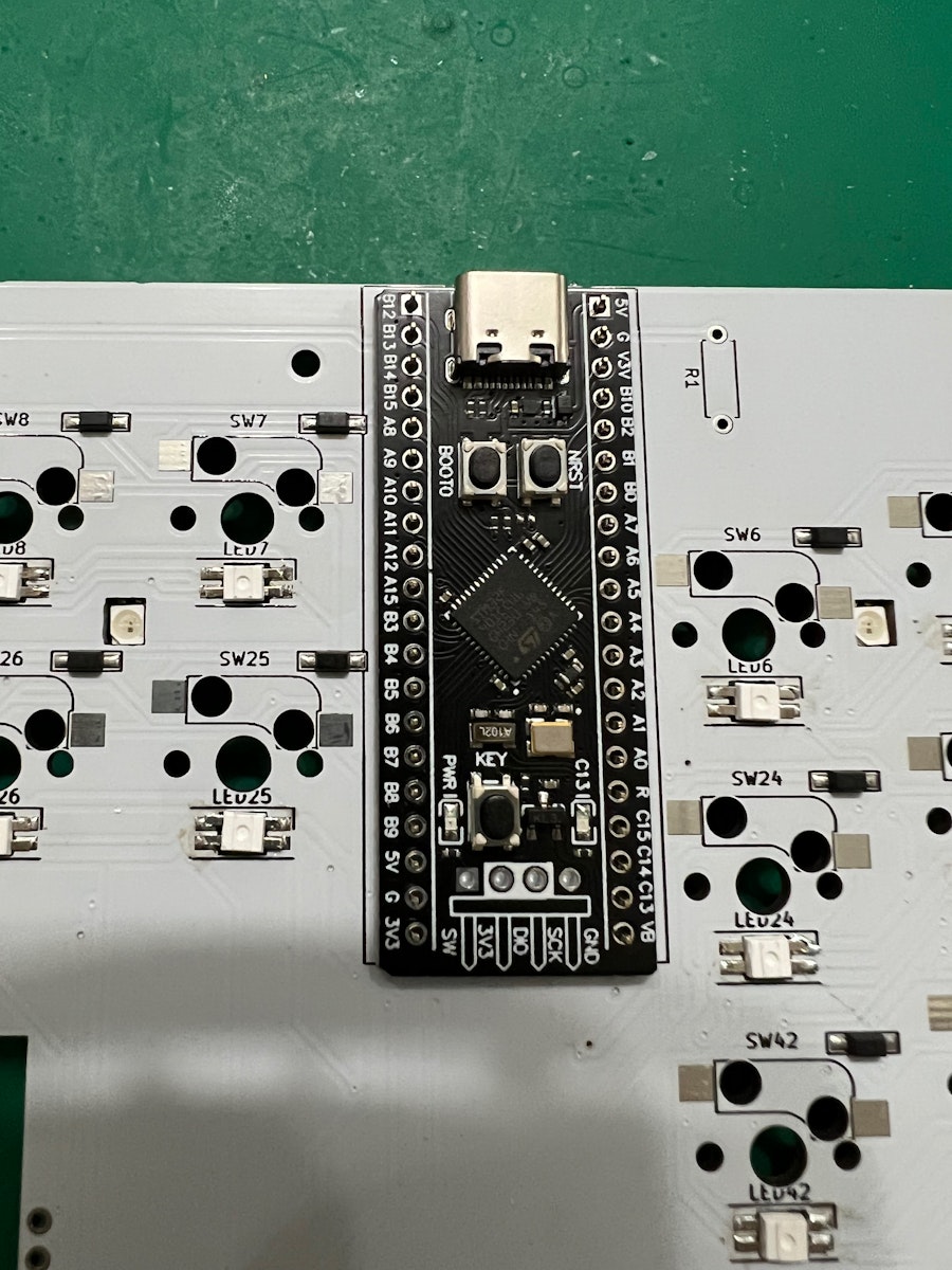 ソケットやダイオードがついている面にBlackPillのチップなどが来るようにキット付属の細ピンヘッダ(1x20)を使って取り付けます。