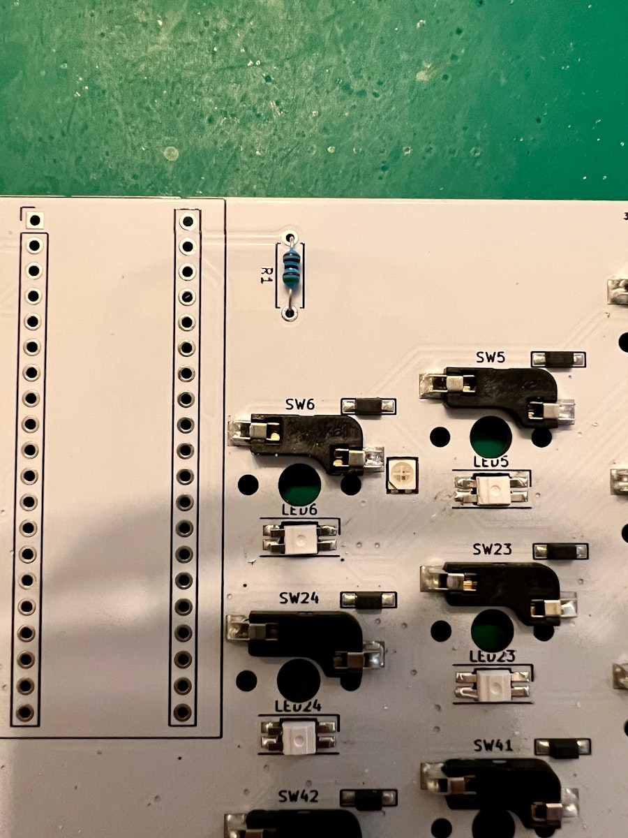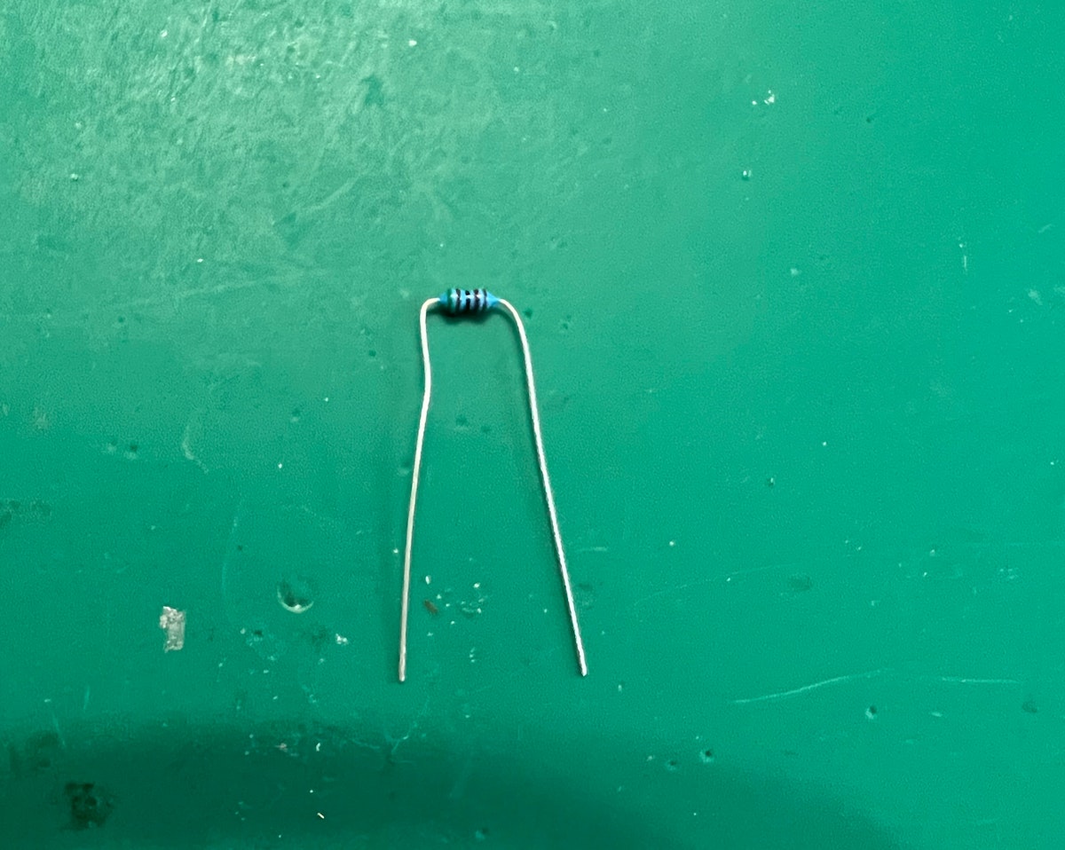 R1と書かれたシルクに抵抗の足を通して半田してニッパーで足を切ってください。