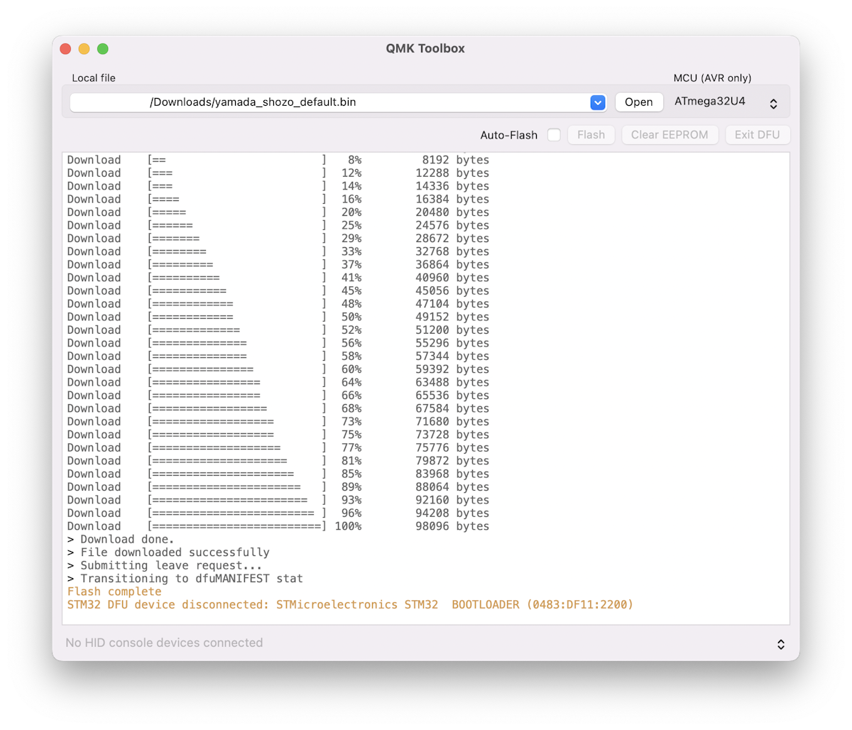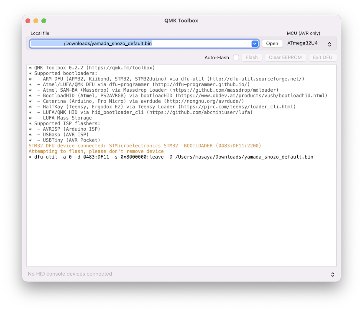 そうするとDFUモードに入り、ファームウェアを書き込むことが出来るようになります。